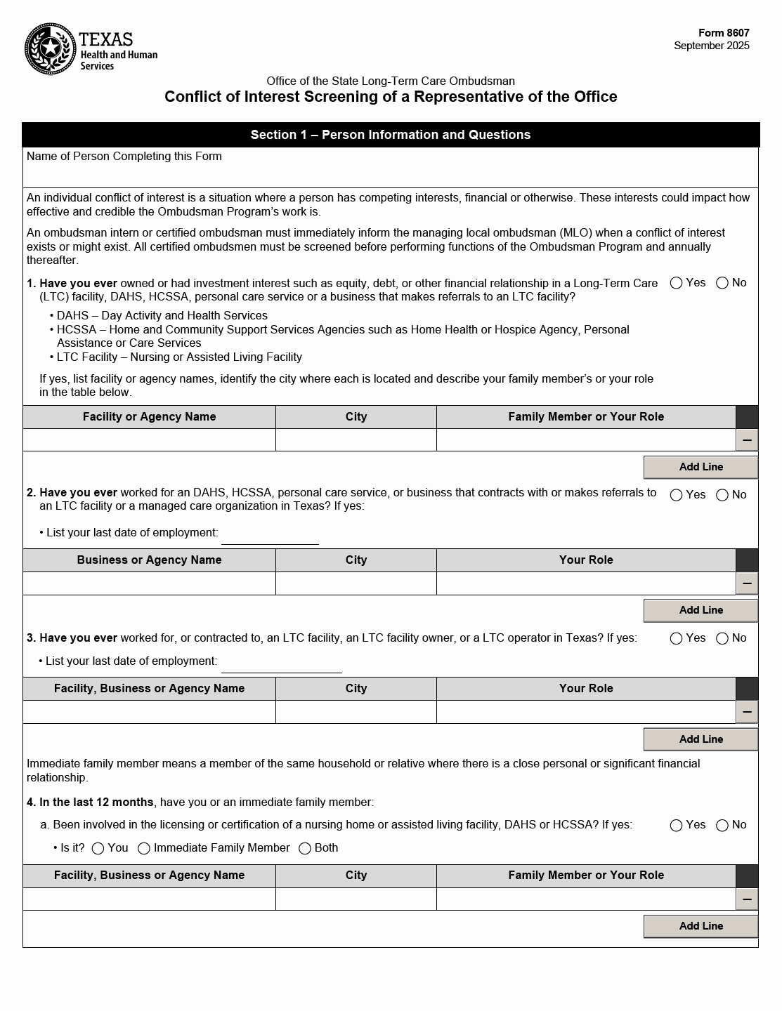 TX HHS Form 8607. Conflict of Interest Screening of a Representative of the Office
