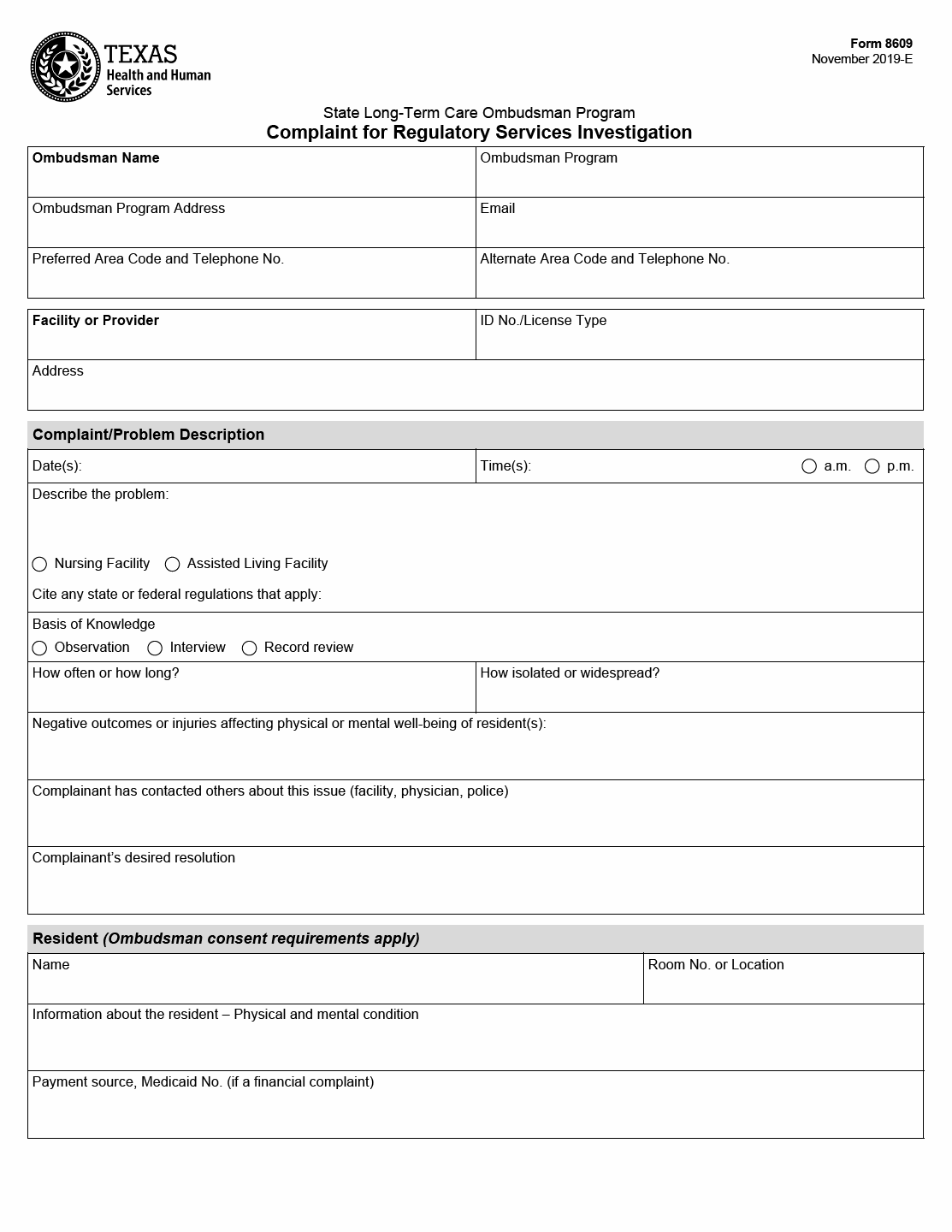 TX HHS Form 8609. State Long-Term Care Ombudsman Program Complaint for Regulatory Services Investigation