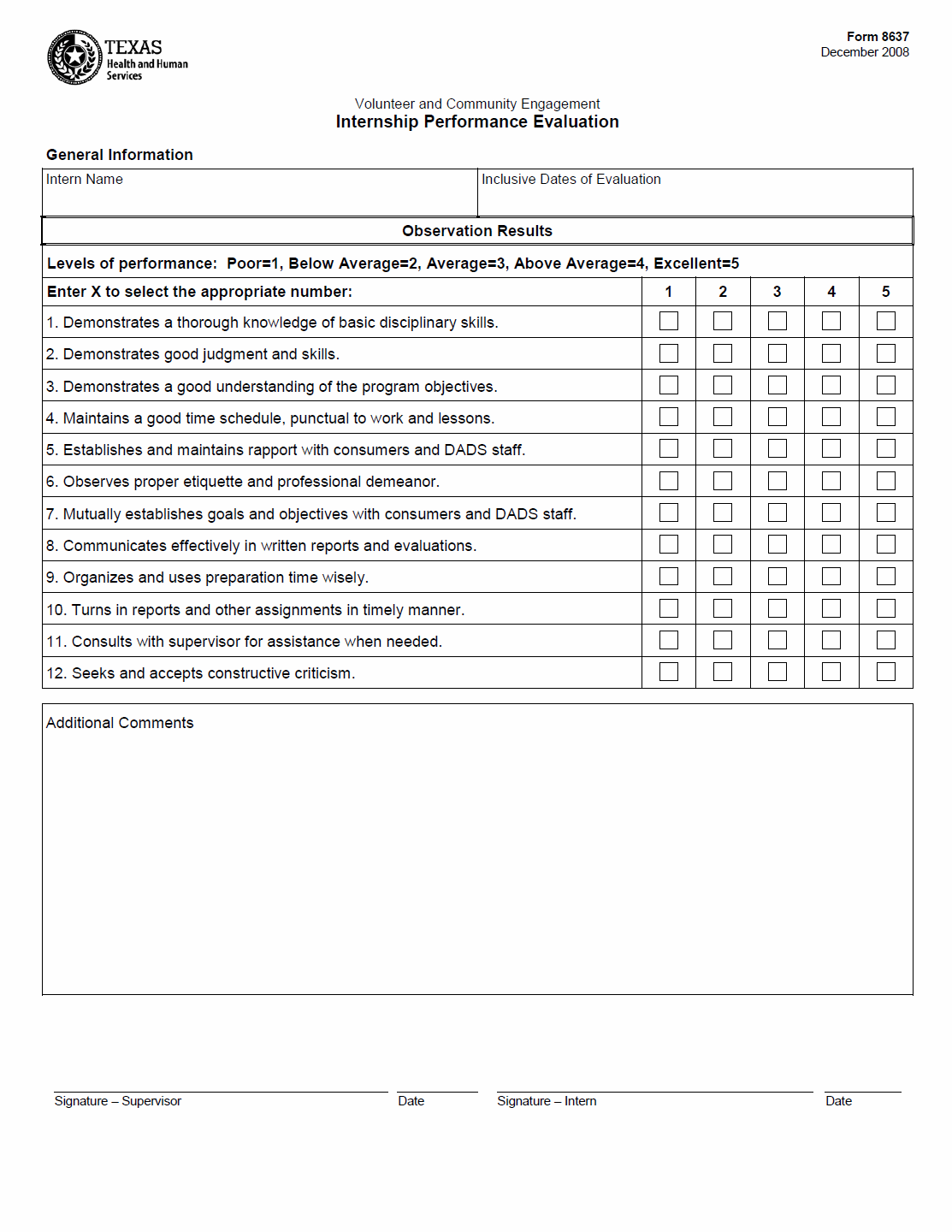 The TX HHS Form 8637, Internship Performance Evaluation, is a tool used to assess the performance of interns participating in volunteer and community engagement programs. This form helps supervisors evaluate an intern's progress, identify areas for improvement, and provide feedback on their overall performance.