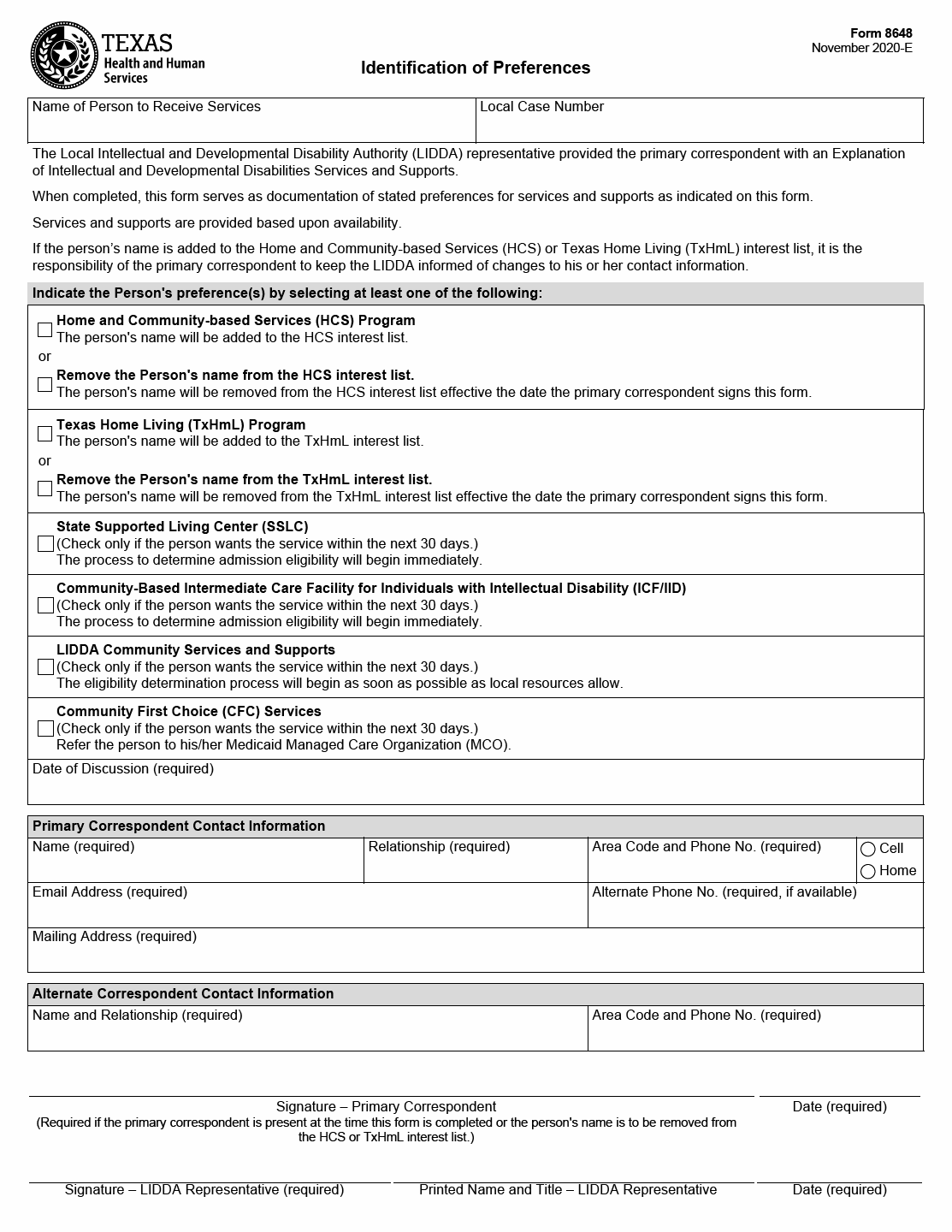 TX HHS Form 8648: Identification of Preferences is a crucial document that helps individuals with intellectual and developmental disabilities identify their preferences for services and supports. This form serves as documentation of stated preferences, allowing the Local Intellectual and Developmental Disability Authority (LIDDA) to provide personalized care.