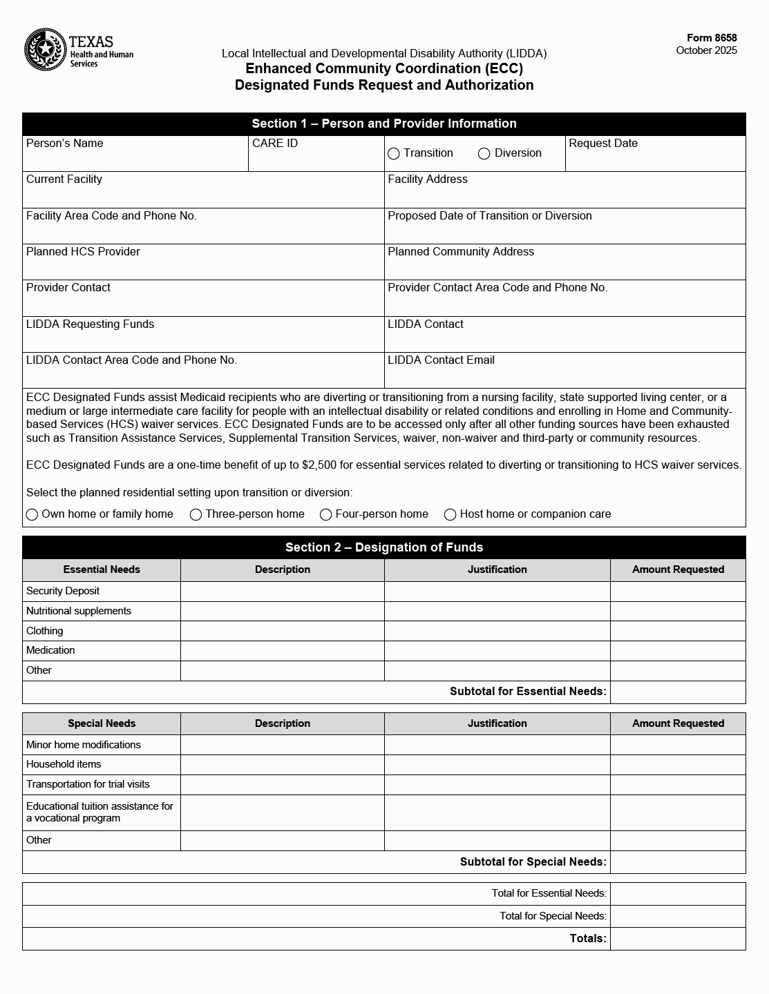 TX HHS Form 8658. Enhanced Community Coordination (ECC) Designated Funds Request and Authorization