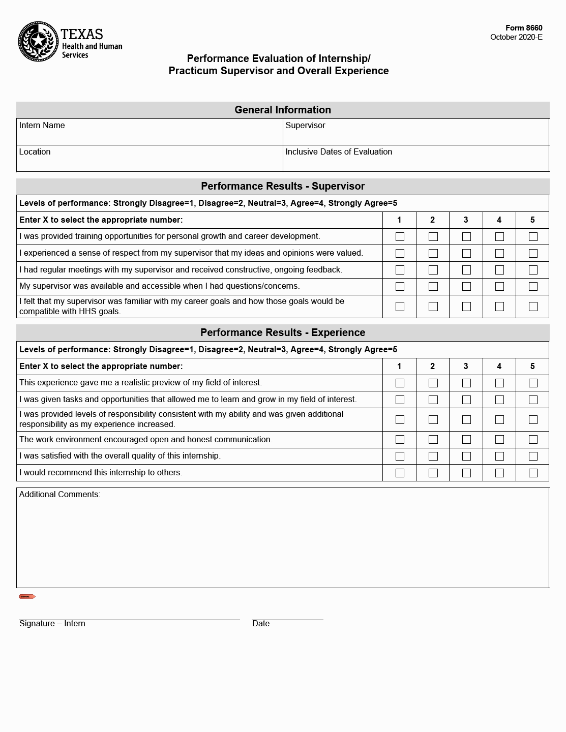 TX HHS Form 8660. Performance Evaluation of Internship/Practicum Supervisor and Overall Experience