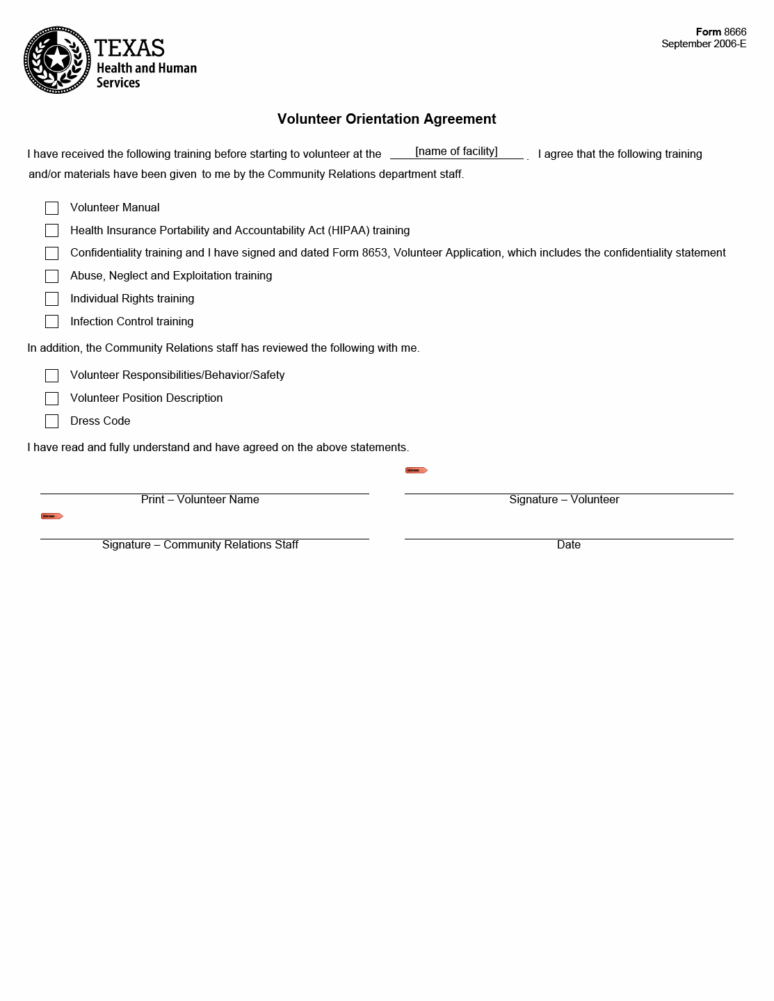 TX HHS Form 8666. Volunteer Orientation Agreement