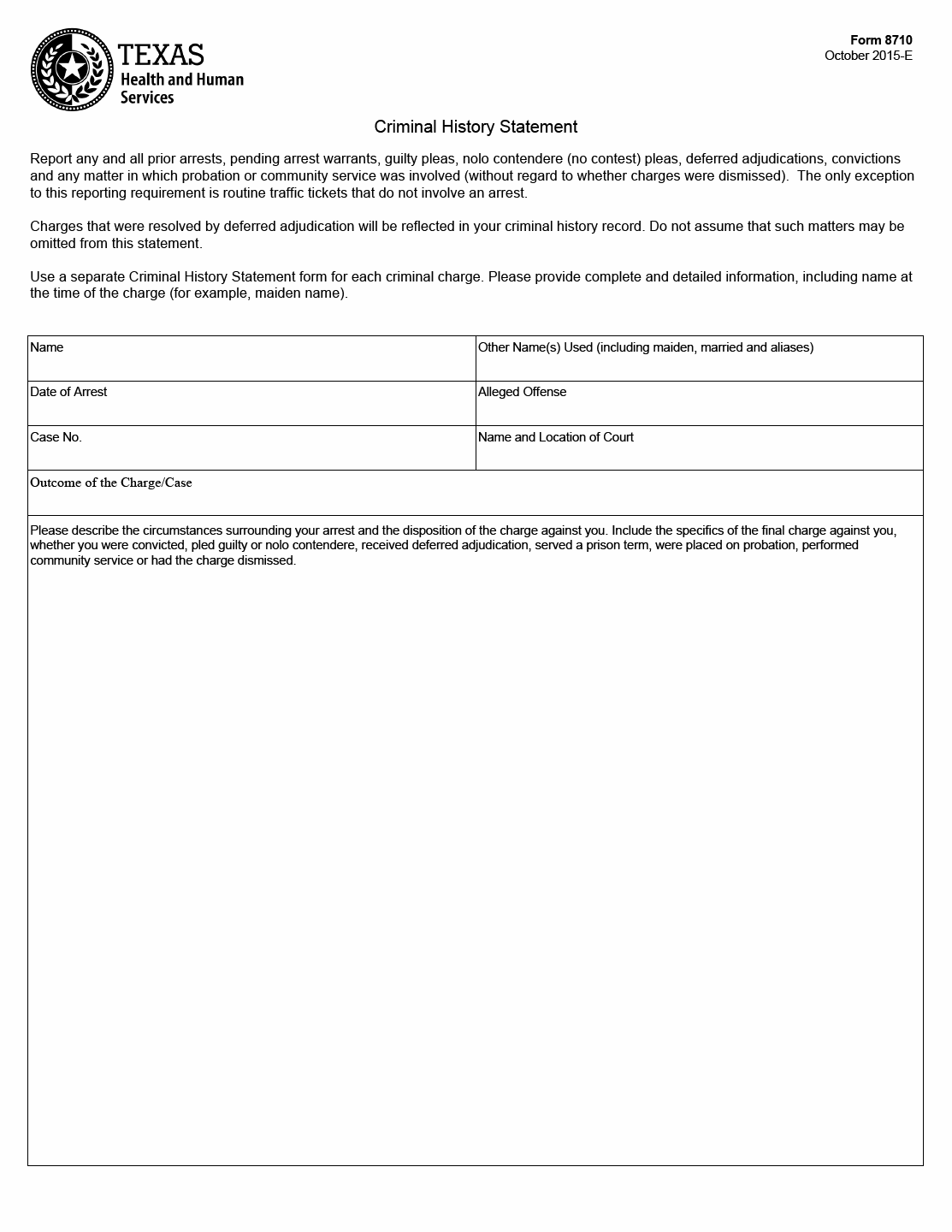 The Texas Health and Human Services (HHS) Form 8710, Criminal History Statement, is a crucial document that helps individuals disclose their criminal history to the state. This form is typically used in situations where an individual's criminal record needs to be verified, such as when applying for employment, licensing, or other government benefits.