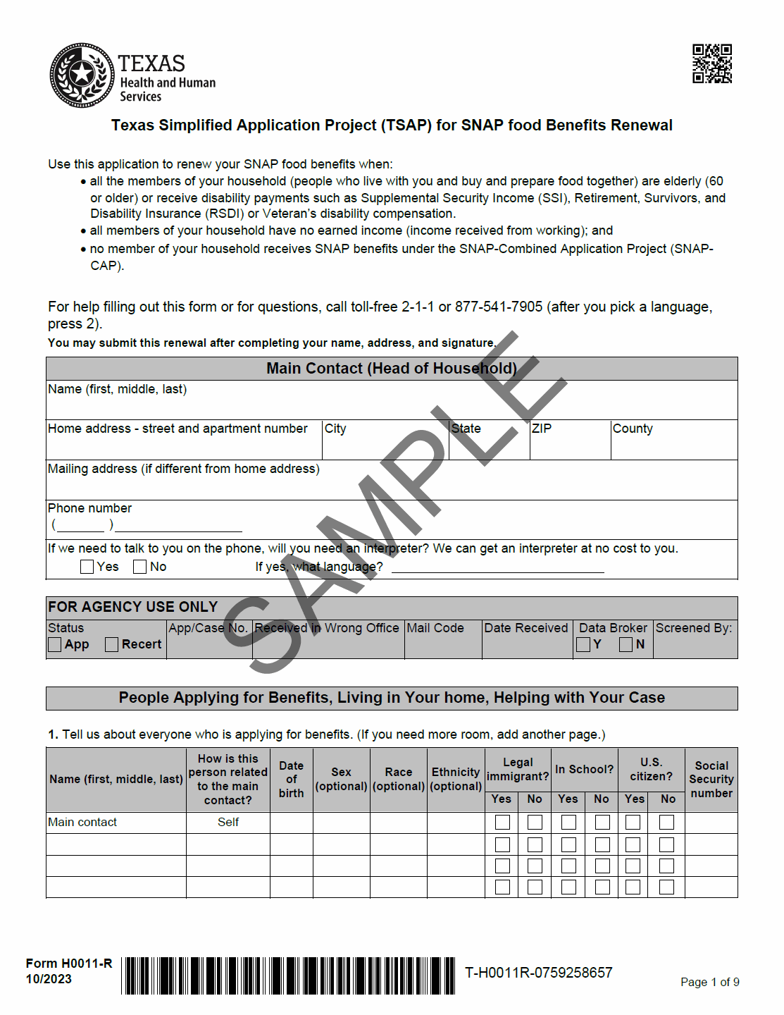 TX HHS Form H0011-R. Texas Simplified Application Project (TSAP) for SNAP Food Benefits Renewal