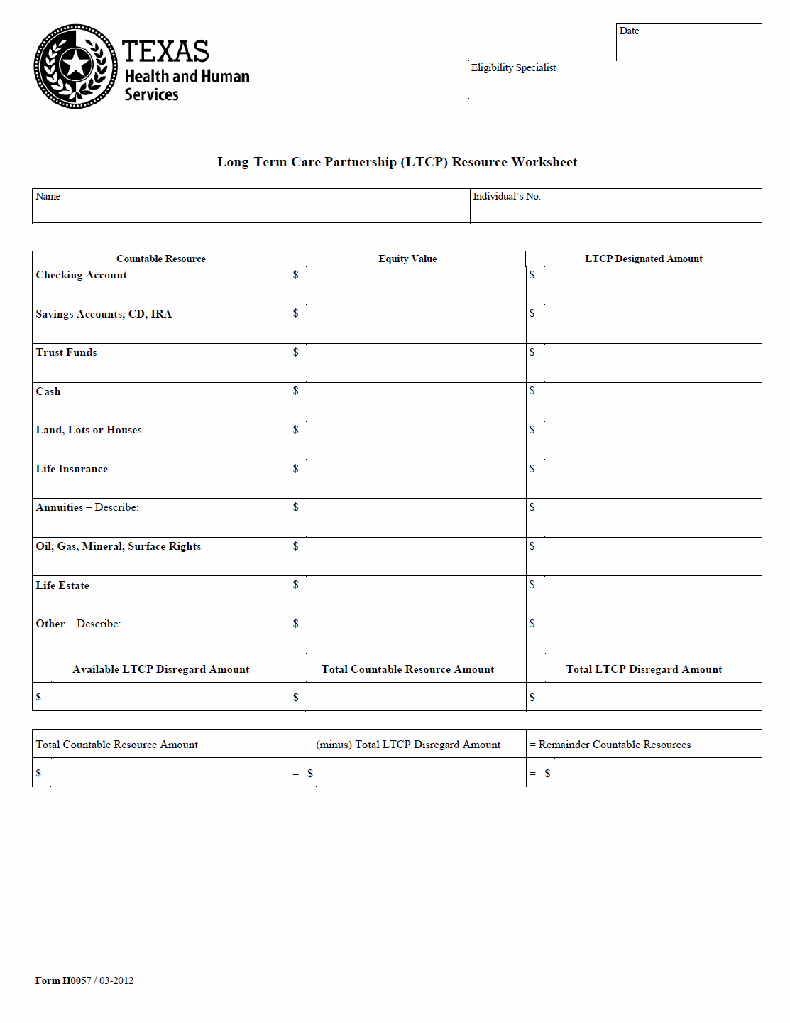 TX HHS Form H0057. Long-Term Care Partnership (LTCP) Resource Worksheet