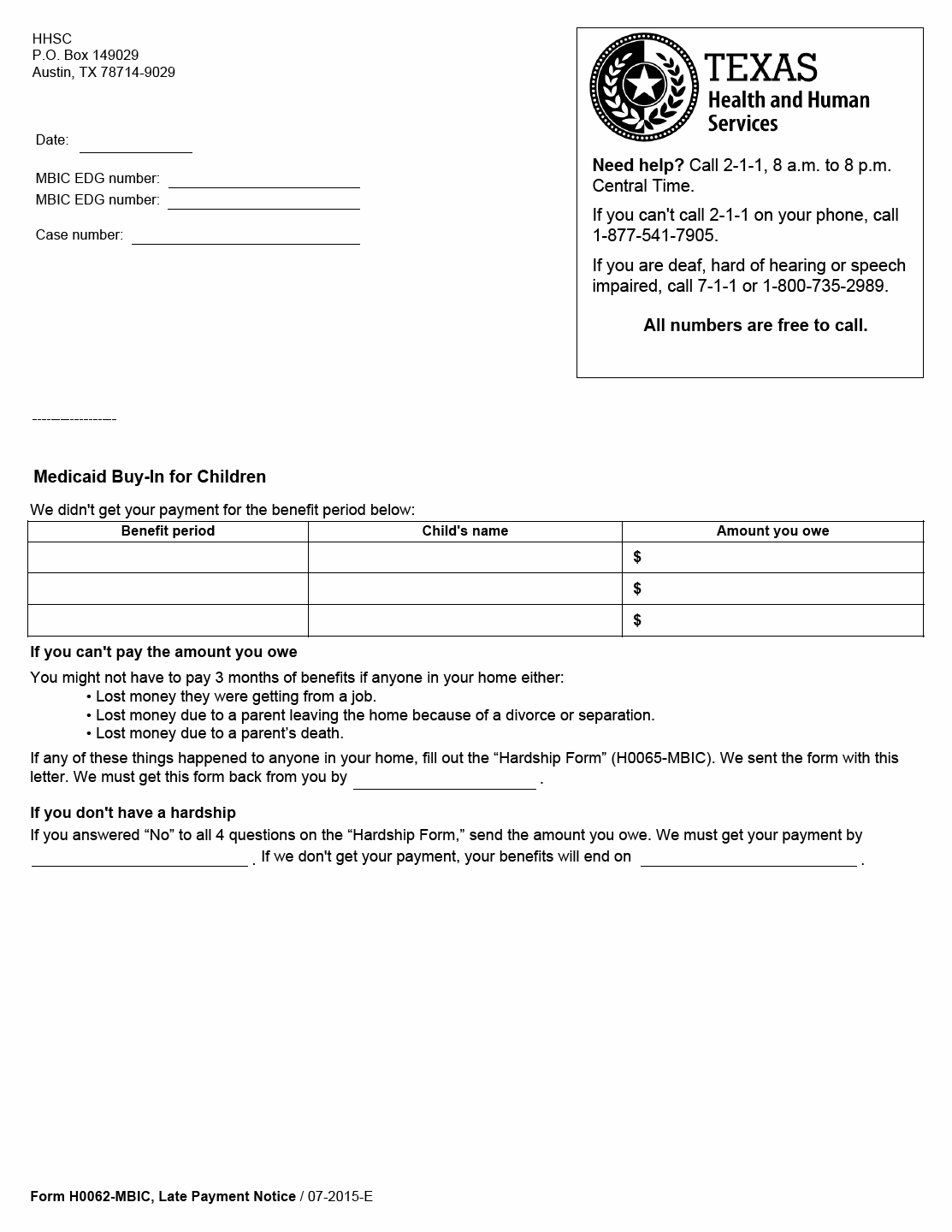 TX HHS Form H0062-MBIC. Late Payment Notice