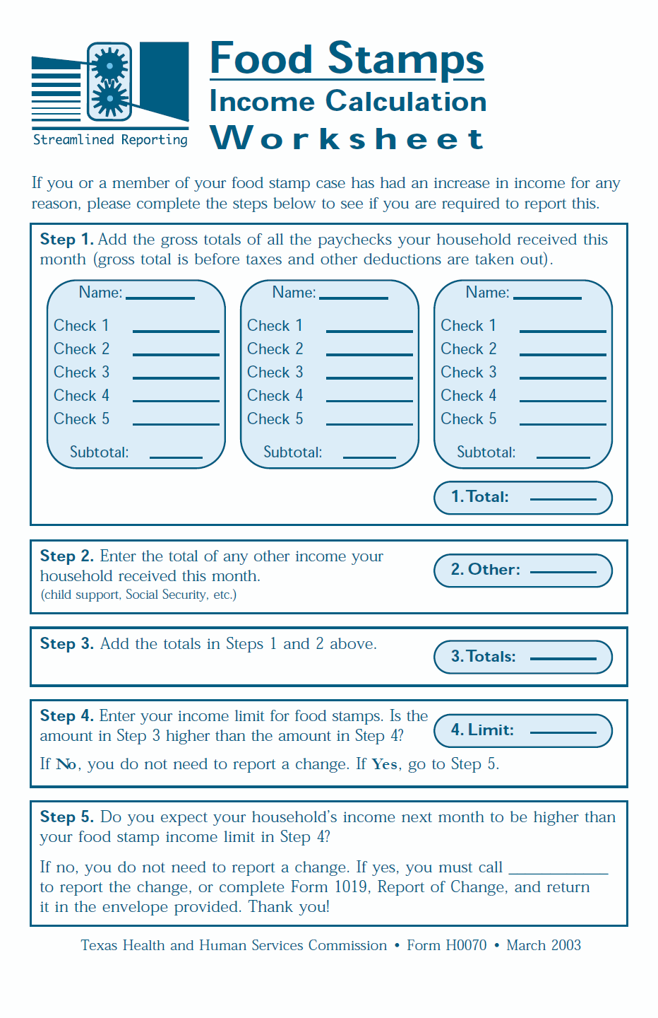 TX HHS Form H0070. Food Stamps Streamlined Reporting (Income Calculation Worksheet)