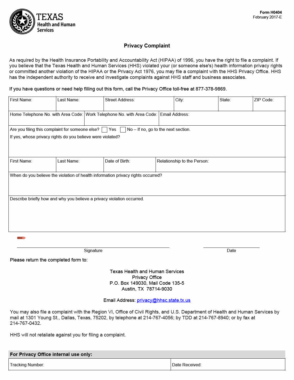 The Texas Health and Human Services (HHS) Form H0404, Privacy Complaint, is a crucial document that helps individuals file complaints related to health information privacy rights violations. This form is typically used by individuals who believe their own or someone else's health information privacy rights have been breached.