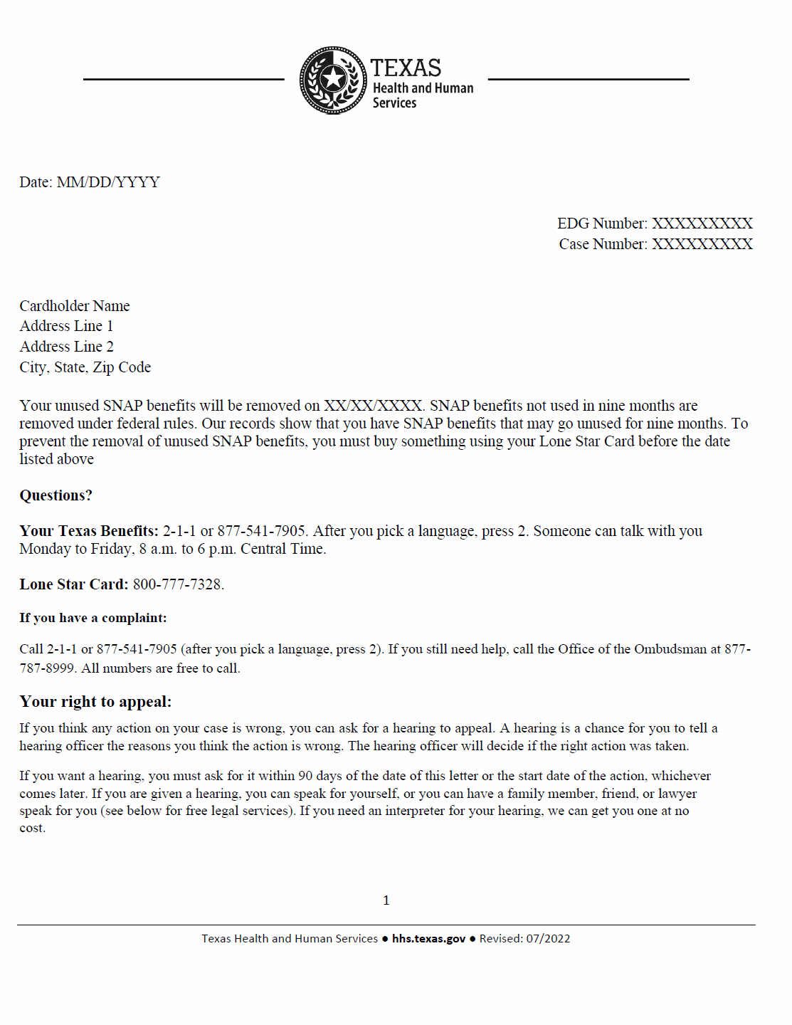 This notice informs the cardholder that their unused SNAP benefits will be removed on a specified date and outlines the steps they can take to prevent this removal. The form emphasizes the importance of buying something using their Lone Star Card before the listed date to avoid the removal of unused benefits. It also provides contact information for questions, complaints, and appeals.