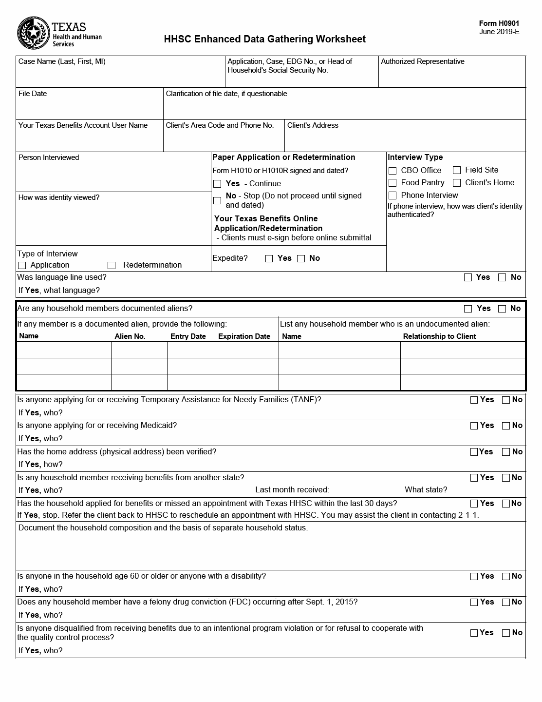 TX HHS Form H0901. HHSC Enhanced Data Gathering Worksheet