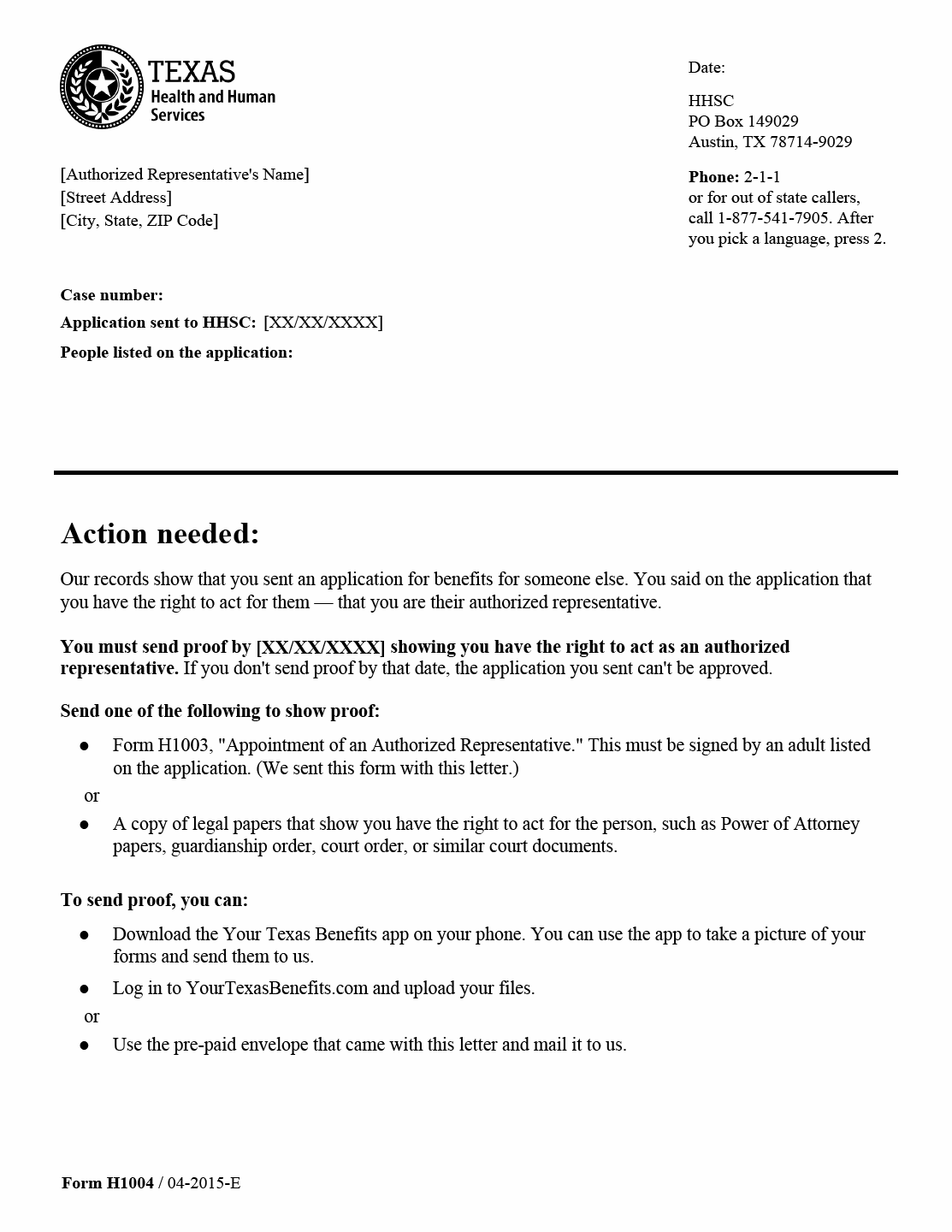 TX HHS Form H1004. Cover Letter Authorized Representative Not Verified