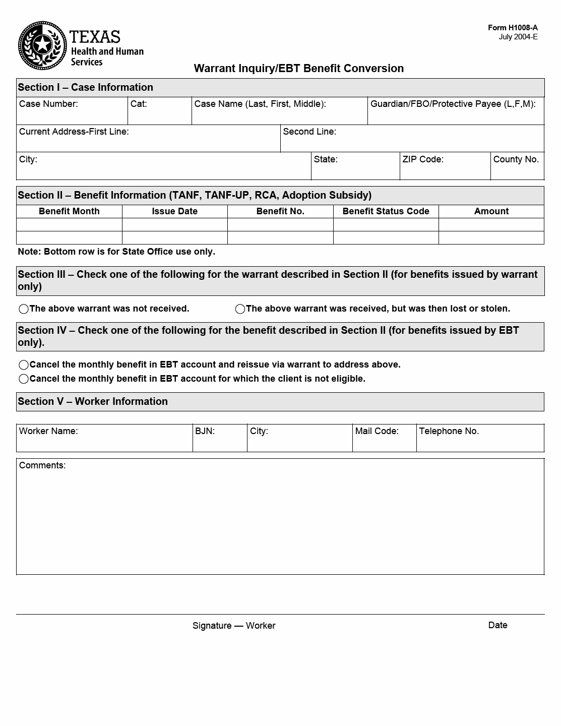 TX HHS Form H1008-A. Warrant Inquiry and EBT Benefit Conversion and Affidavit for Non-receipt of Warrant