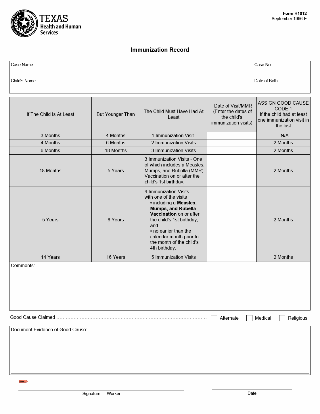 The TX HHS Form H1012, Immunization Record, helps parents and caregivers track their child's immunization schedule and ensure compliance with vaccination requirements. This form is typically filled out by healthcare providers or parents/guardians to document a child's immunizations and provide evidence of good cause for any exemptions.