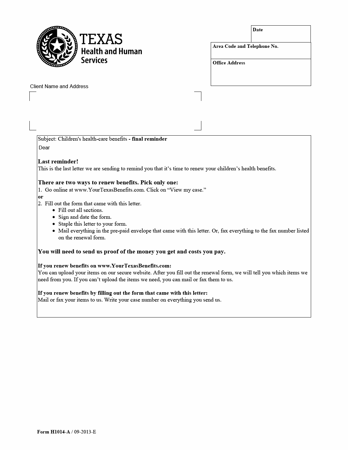 TX HHS Form H1014-A. Children's Health Care Benefits – Final Reminder