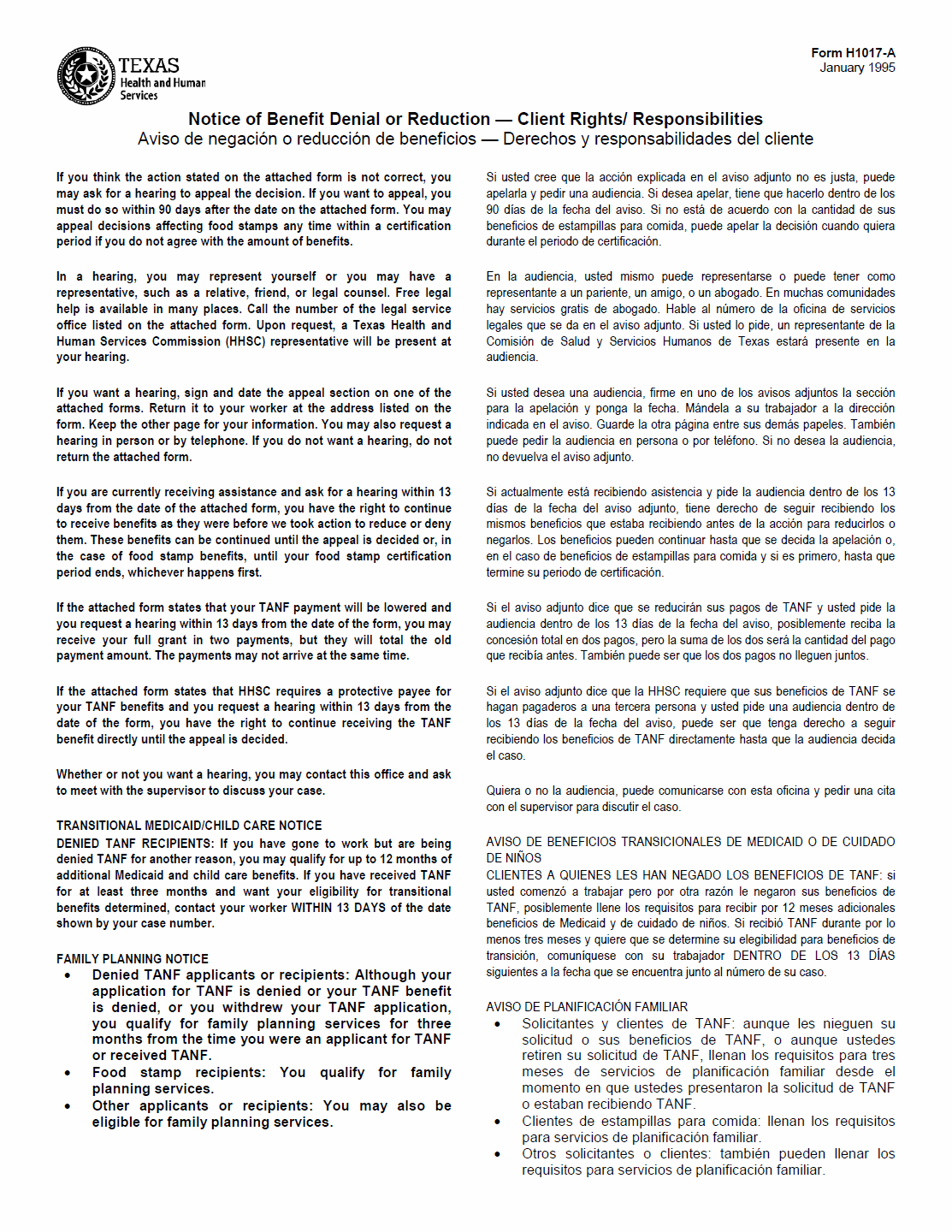 TX HHS Form H1017-A. Notice of Benefit Denial or Reduction - Client Rights/Responsibilities