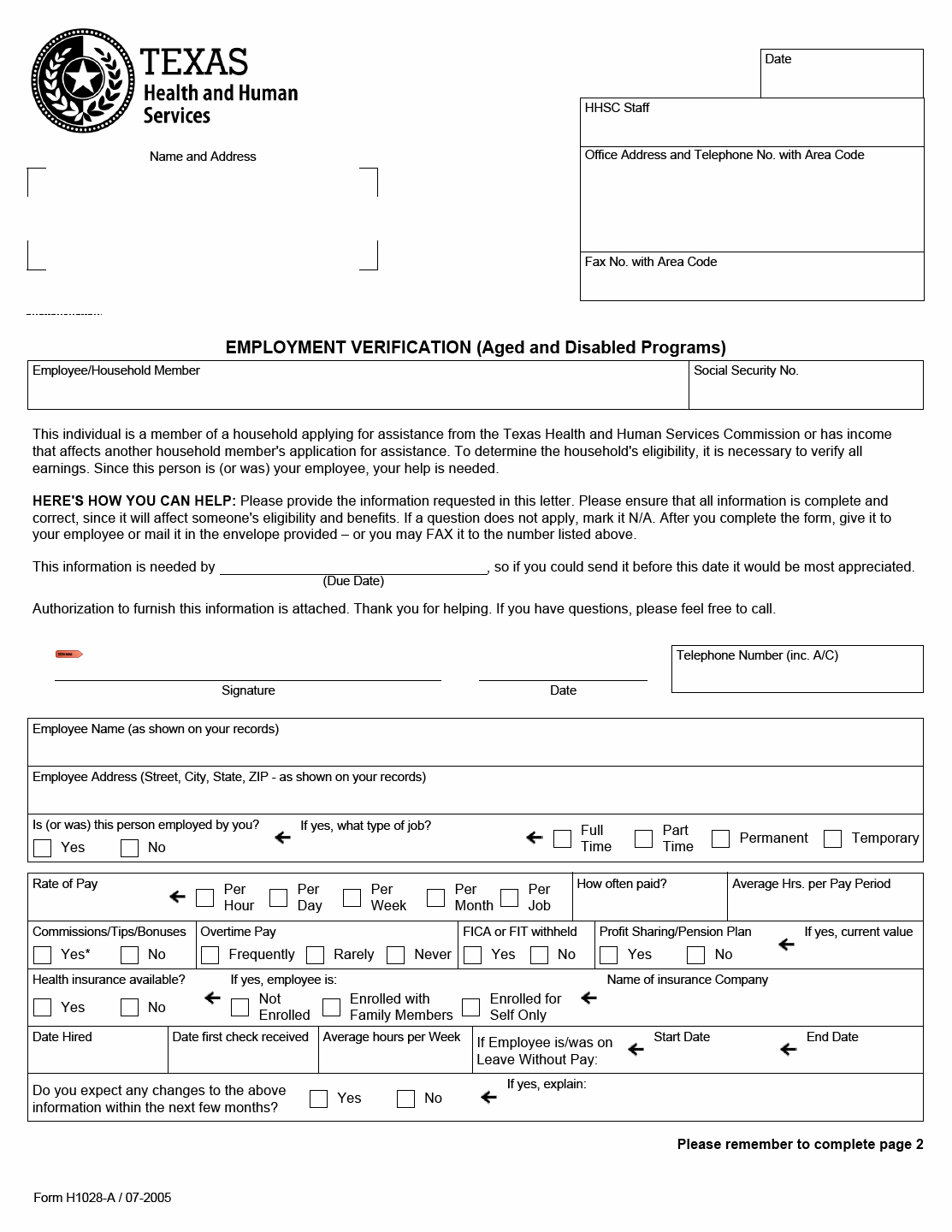 TX HHS Form H1028-A. Employment Verification (Aged and Disabled Programs)