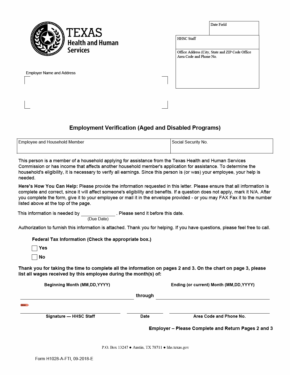 TX HHS Form H1028-A-FTI. Employment Verification - FTI