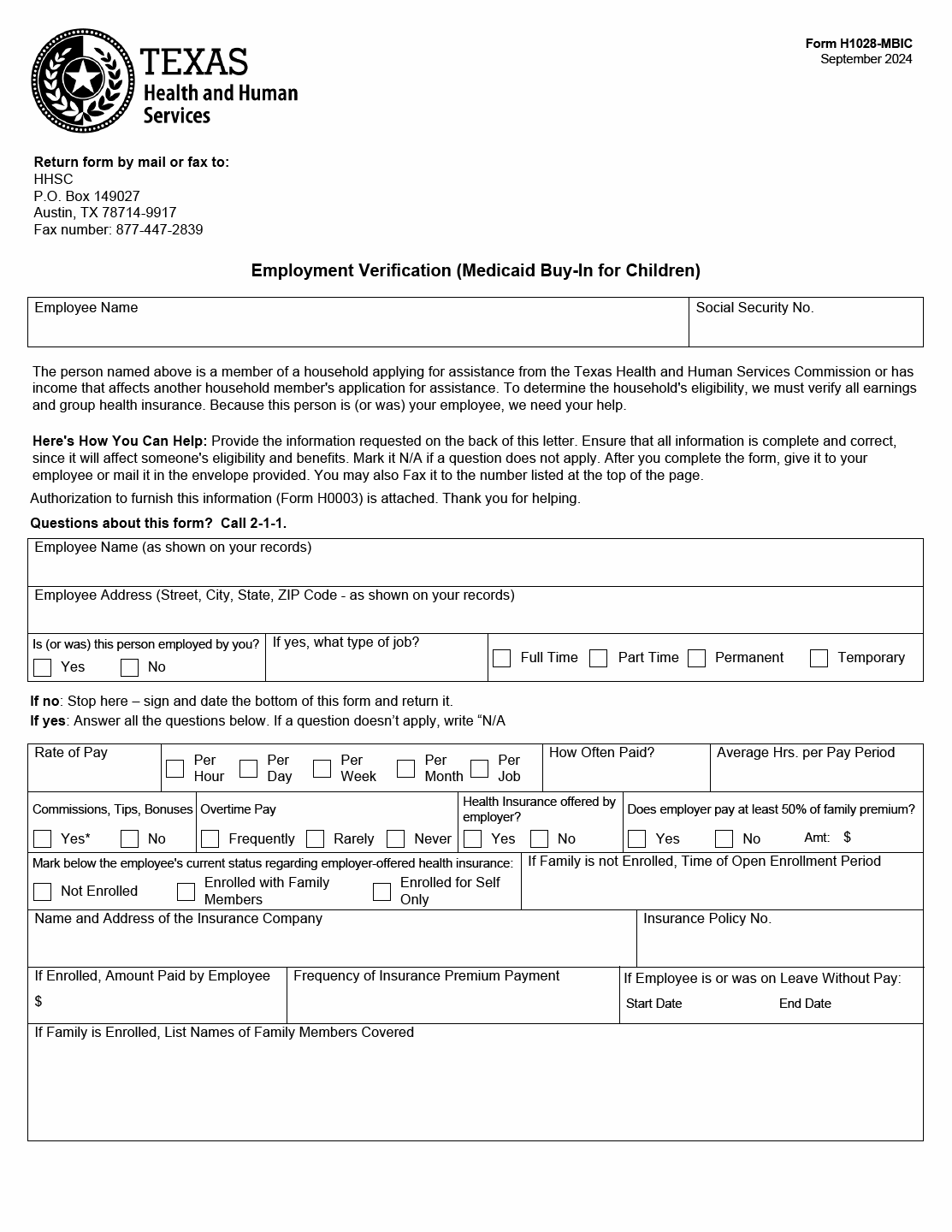 TX HHS Form H1028-MBIC. Employment Verification (Medicaid Buy-In for Children)