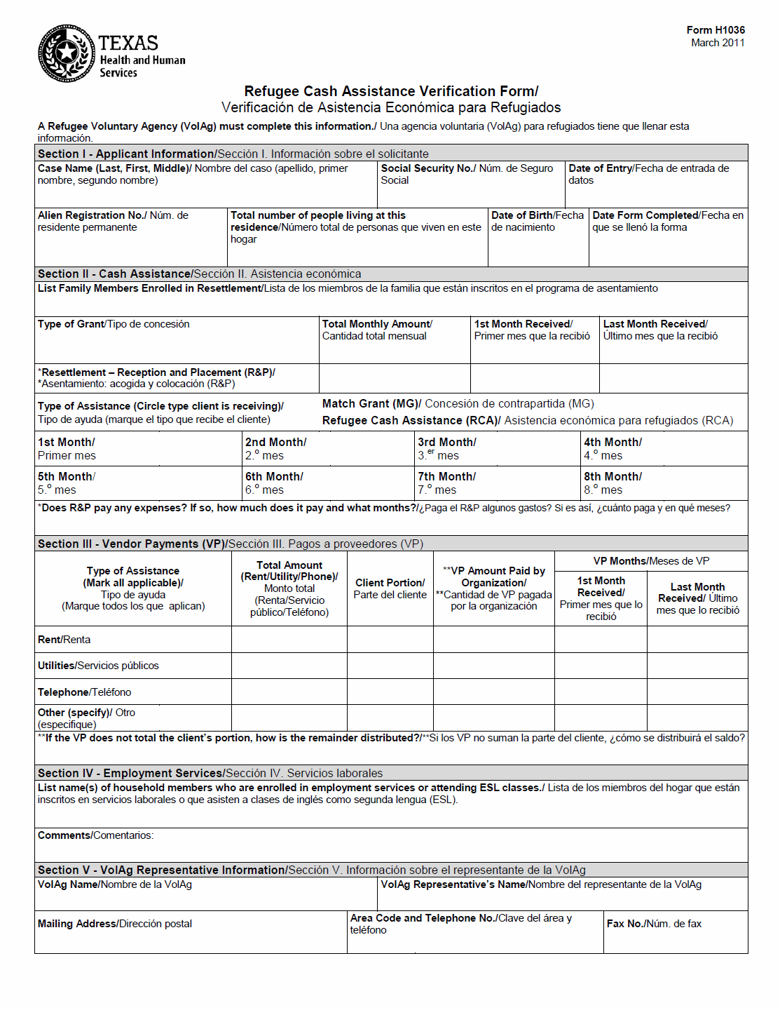 TX HHS Form H1036. Refugee Cash Assistance Verification Form