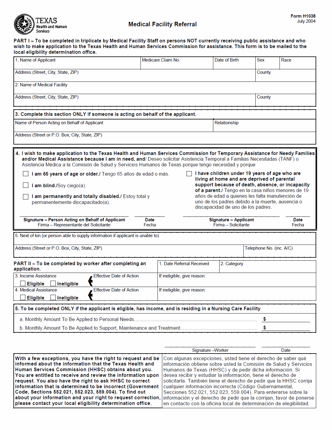 The Texas HHS Form H1038, Medical Facility Referral, is a crucial document for individuals seeking assistance from the Texas Health and Human Services Commission. This form helps solve the problem of applying for Temporary Assistance for Needy Families (TANF) and/or Medical Assistance, providing essential support to those in need.