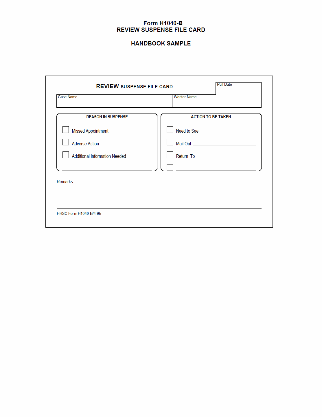 This form is typically used in situations where patients have missed appointments, require additional information, or are subject to adverse action. The card requires the following information: Missed Appointment, Need to See, Adverse Action, CF Maiout (additional information needed), and Return To. Remarks. The HHSC Form H1040-B/4-95 provides a sample review suspense file card for reference.