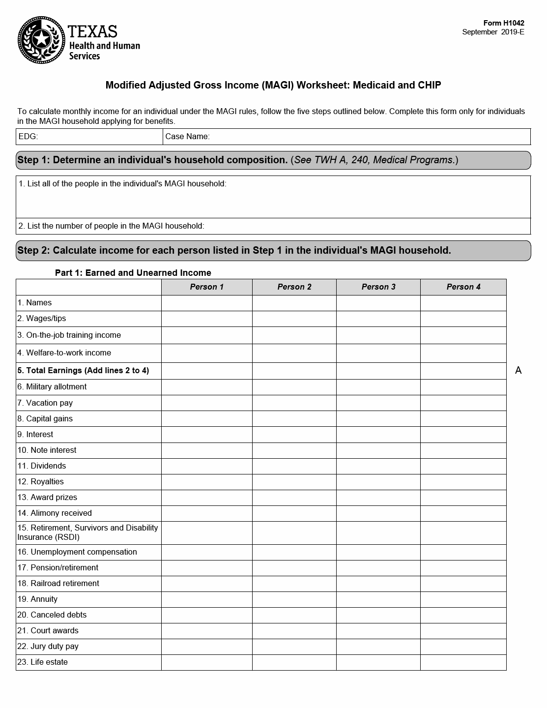 TX HHS Form H1042. Modified Adjusted Gross Income (MAGI) Worksheet
