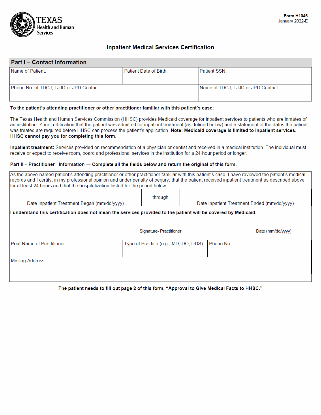 TX HHS Form H1046. Inpatient Medical Services Certification