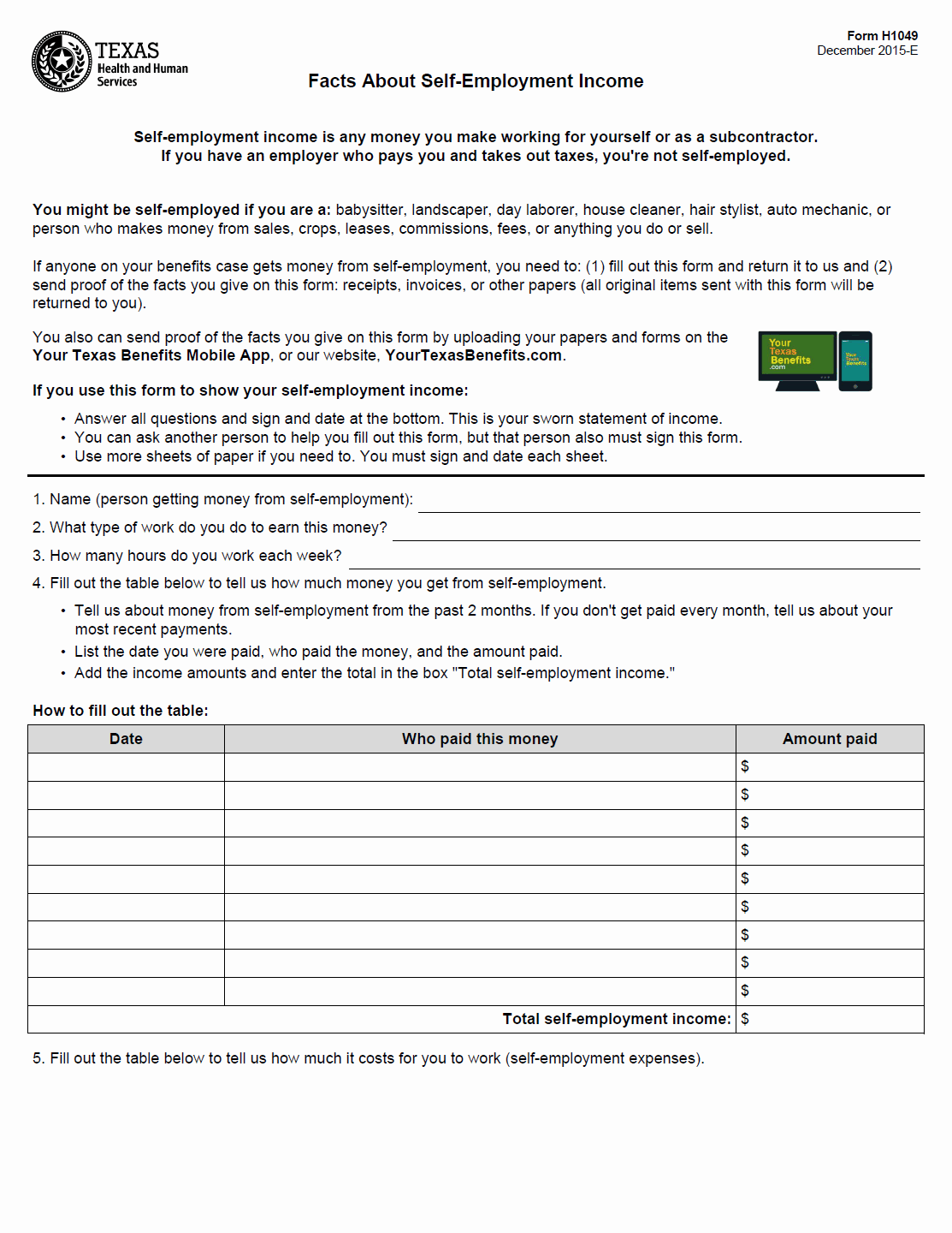 TX HHS Form H1049. Client's Statement of Self-Employment Income