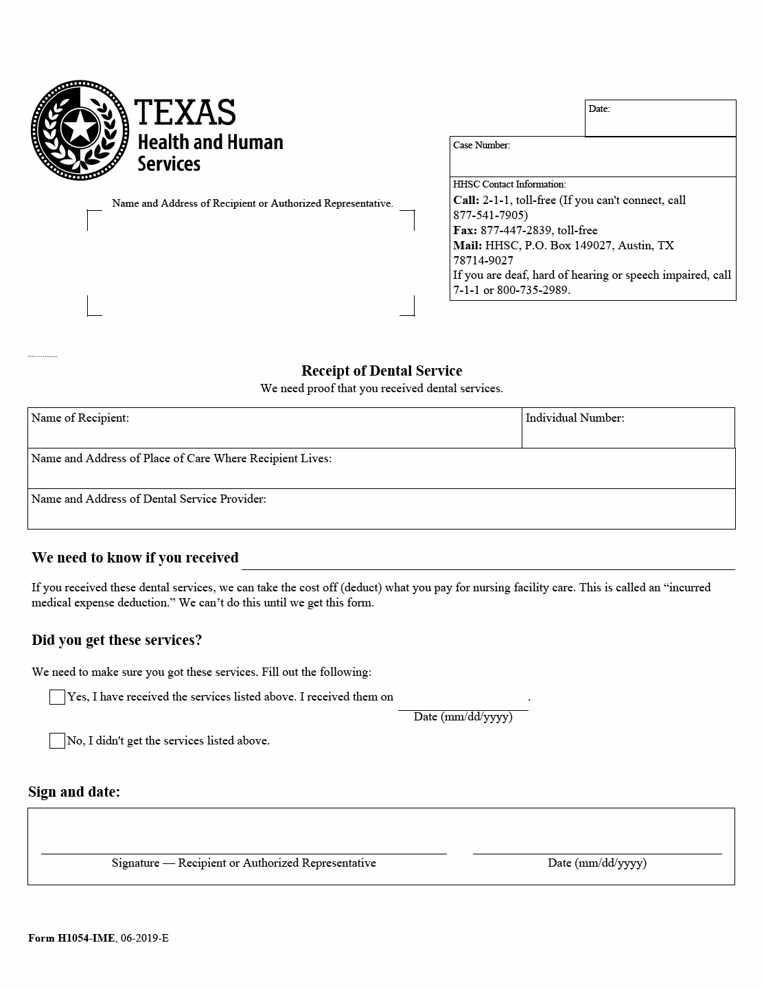 TX HHS Form H1054-IME. Receipt of Dental Service