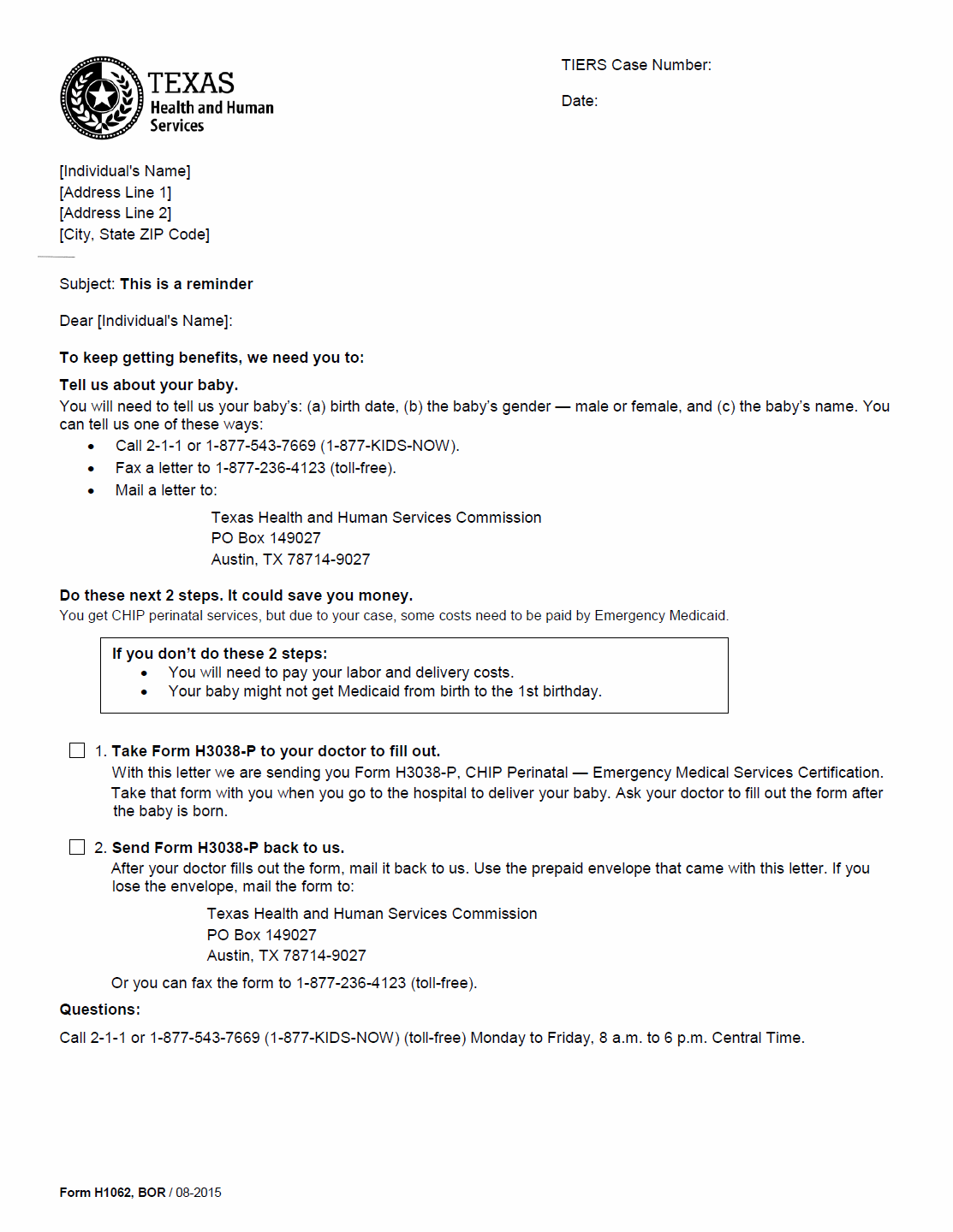 This reminder letter highlights two essential steps that must be taken to maintain eligibility and avoid potential costs: (1) filling out Form H3038-P, CHIP Perinatal — Emergency Medical Services Certification, with a doctor after the baby's birth; and (2) submitting the completed form back to Texas Health and Human Services Commission. Failure to complete these steps may result in increased costs or loss of Medicaid coverage for the baby.