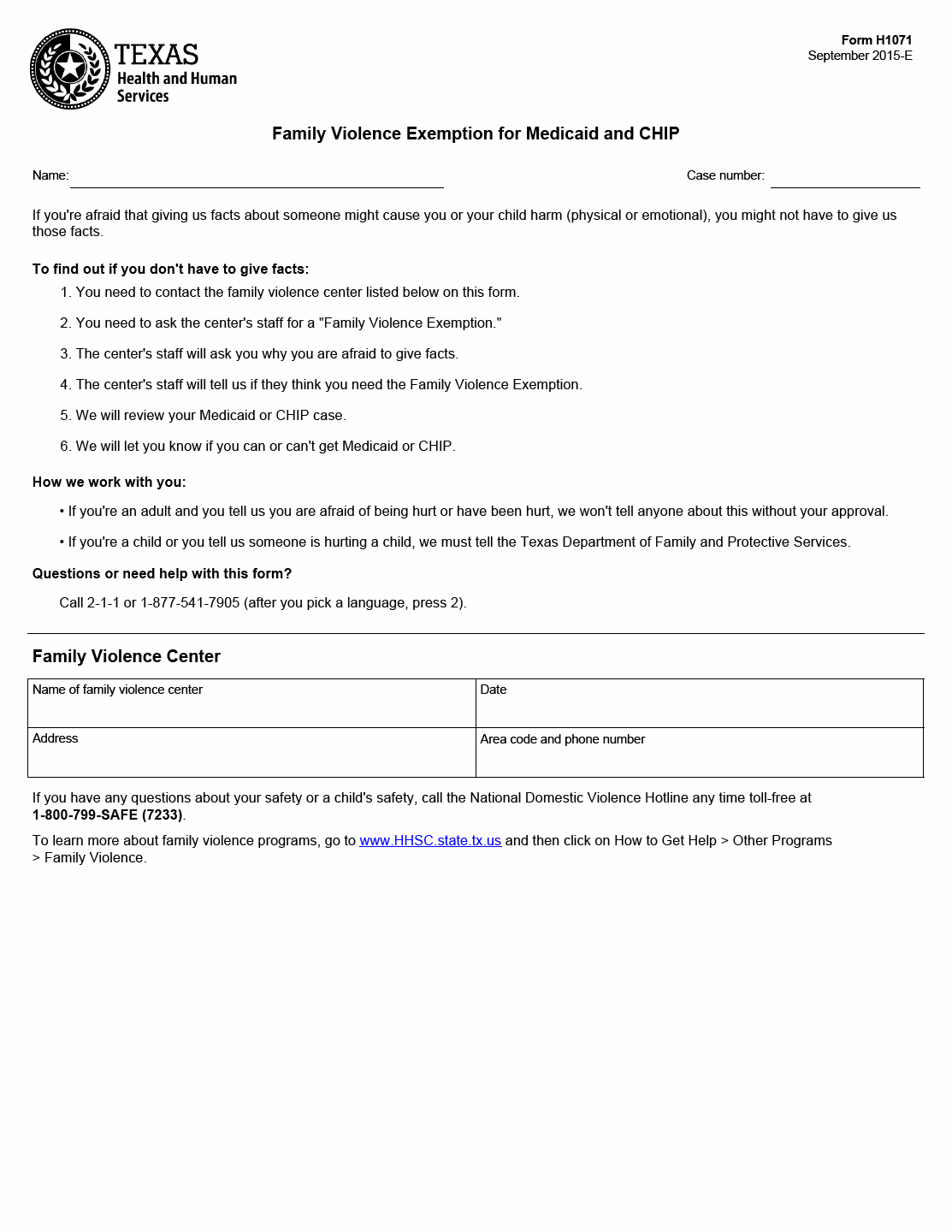 TX HHS Form H1071. Family Violence Exemption for Medicaid and CHIP