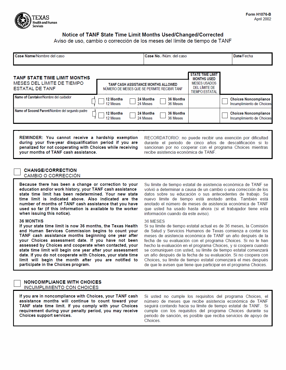 TX HHS Form H1076-B. Notice of TANF State Time Limit Months Used/Changed/Corrected