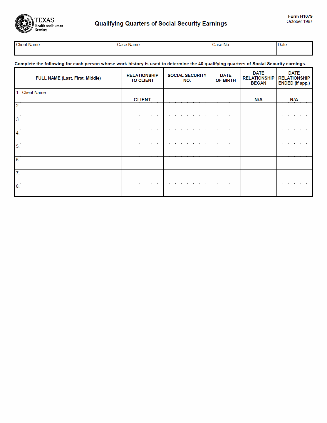 TX HHS Form H1079. Qualifying Quarters of Social Security Earnings