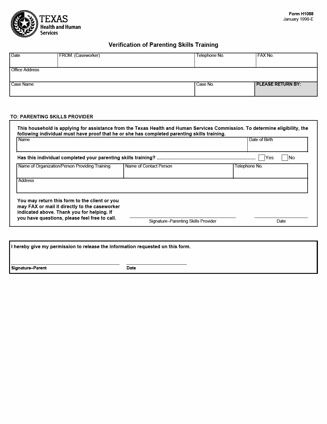 TX HHS Form H1088. Verification of Parenting Skills Training