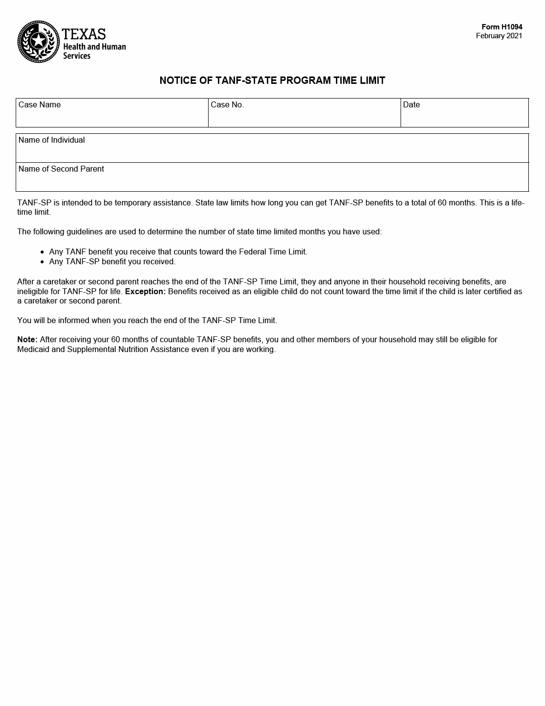 TX HHS Form H1094. Notice of TANF-SP Time Limit