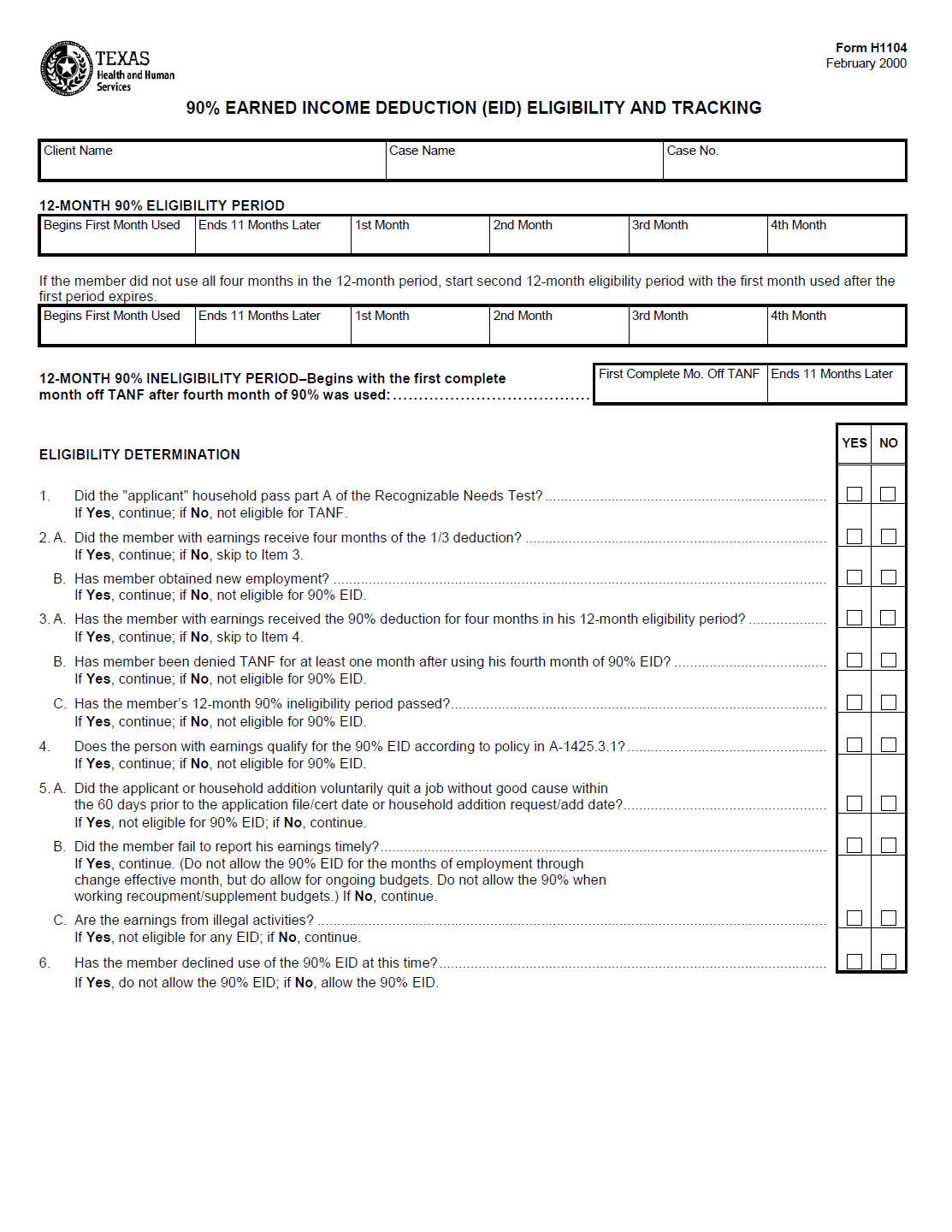 TX HHS Form H1104. 90% Earned Income Deduction (EID) Eligibility and Tracking