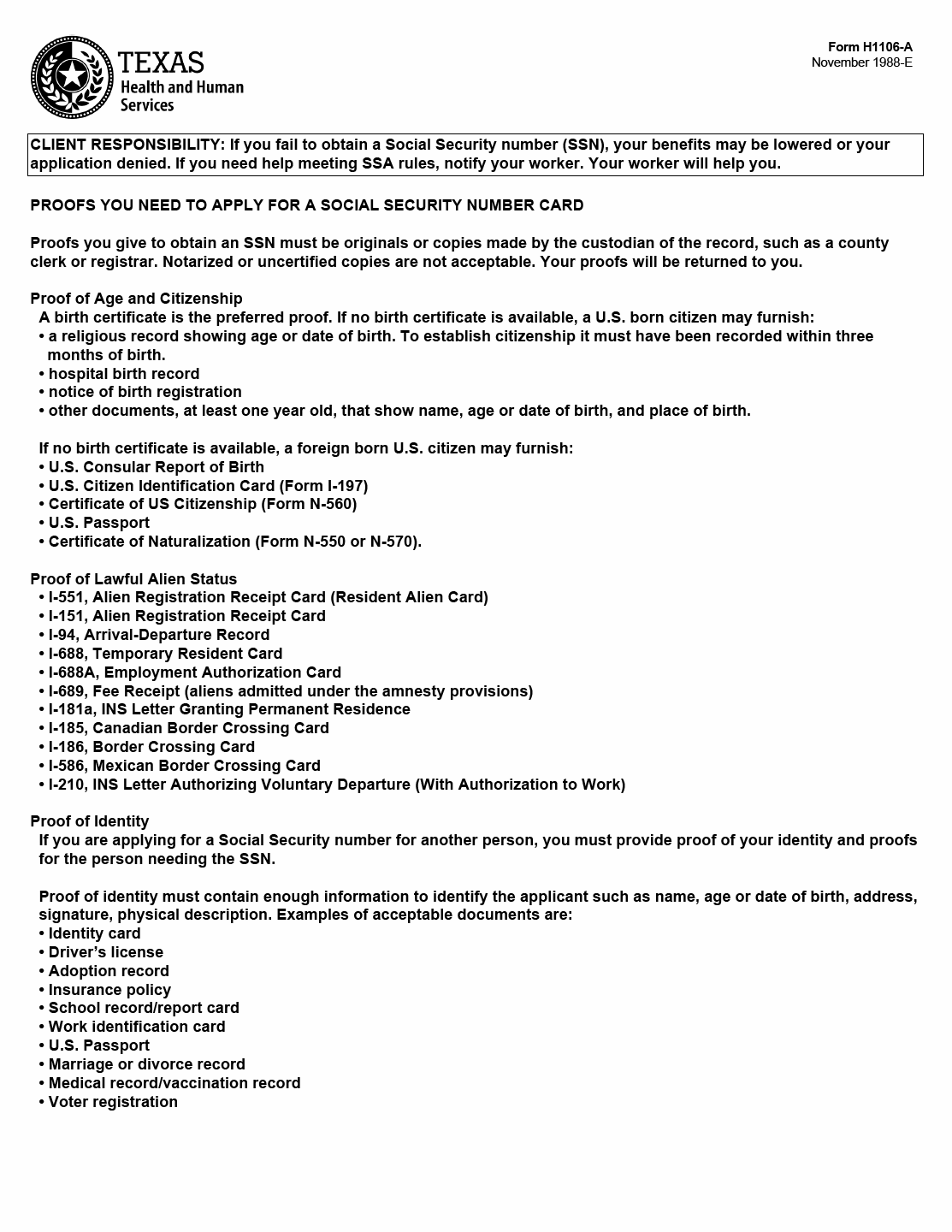 TX HHS Form H1106-A. Proofs You Need to Apply for a Social Security Number Card