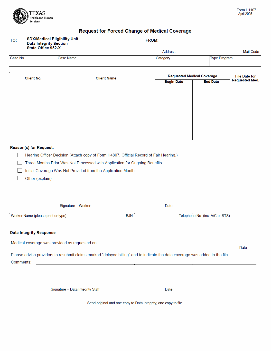 TX HHS Form H1107. Request for Forced Change of Medical Coverage