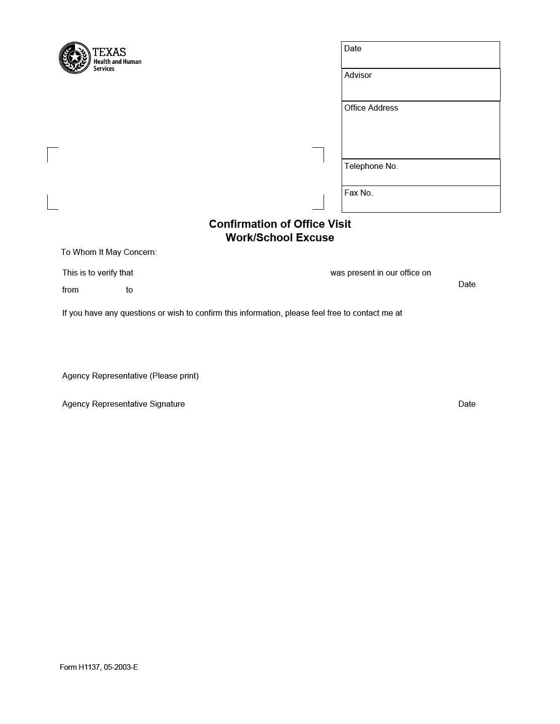 TX HHS Form H1137. Confirmation of Office Visit Work/School Excuse