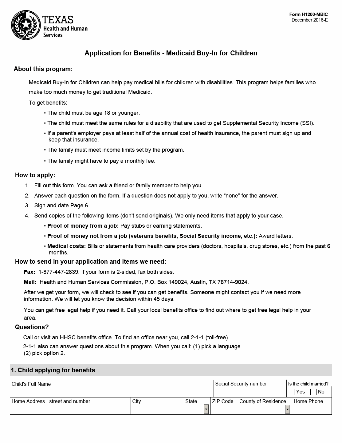 TX HHS Form H1200-MBIC. Application for Benefits Medicaid Buy-In for Children