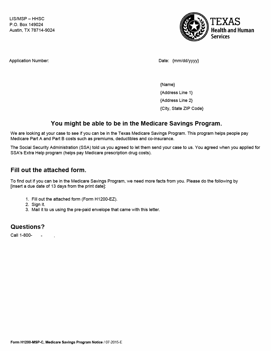 TX HHS Form H1200-MSP-C. Medicare Savings Program Notice