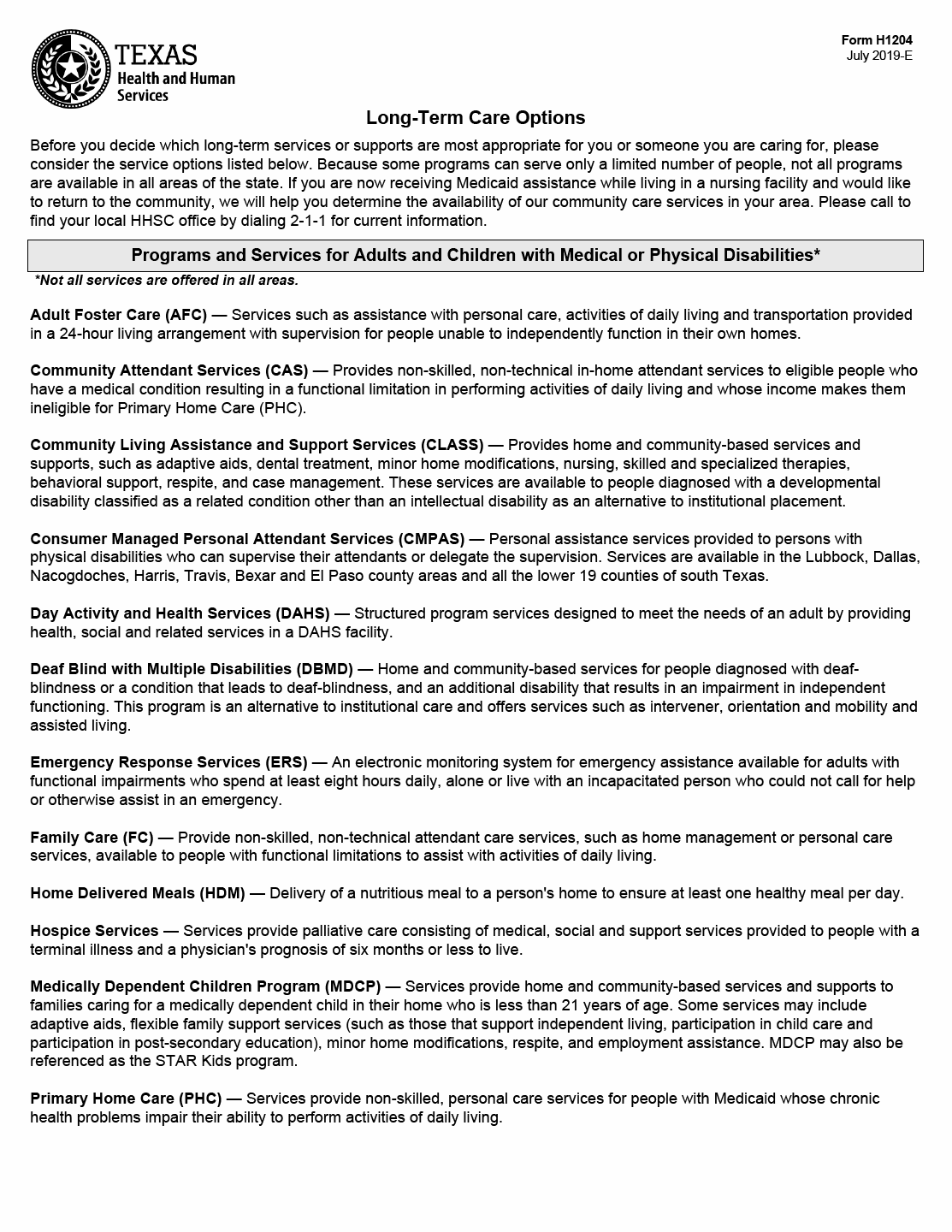 - The form provides an overview of available programs and services offered by Texas Health and Human Services (HHS).