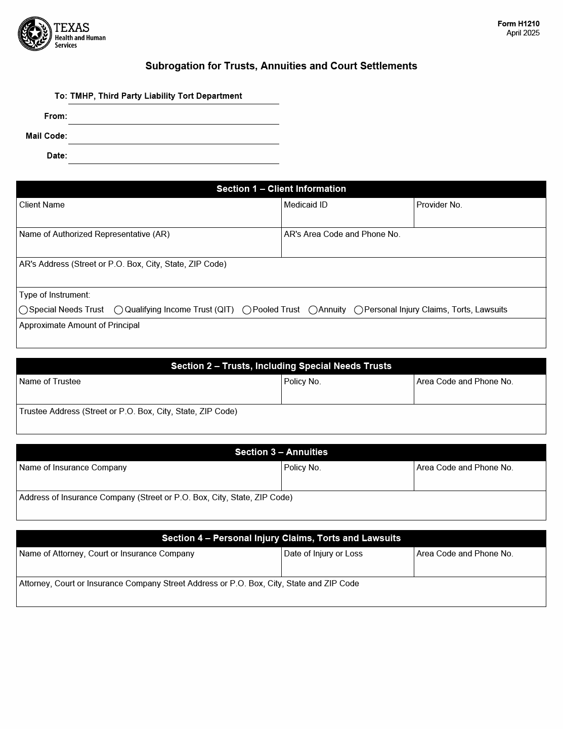 TX HHS Form H1210. Subrogation for Trusts. Annuities and Court Settlements