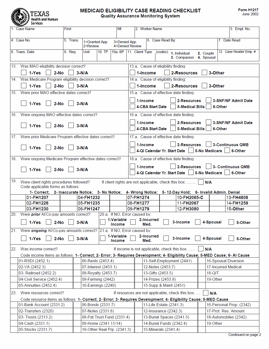 TX HHS Form H1217. Quality Assurance Monitoring System