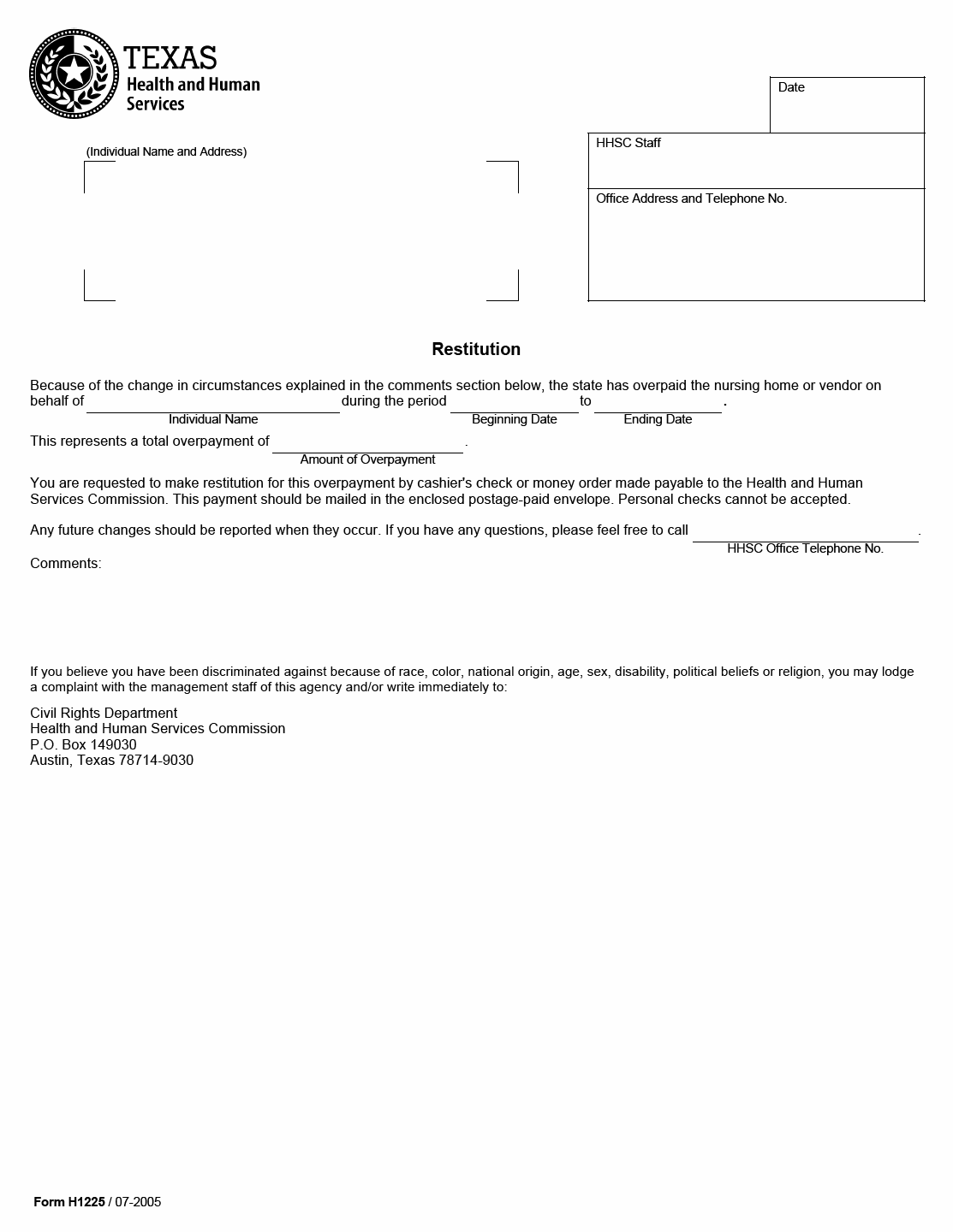 TX HHS Form H1225. Restitution