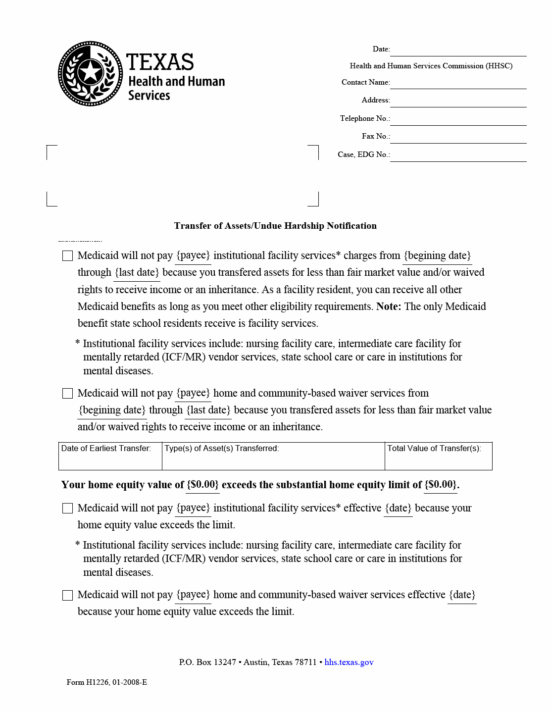 TX HHS Form H1226. Transfer of Assets/Undue Hardship Notification