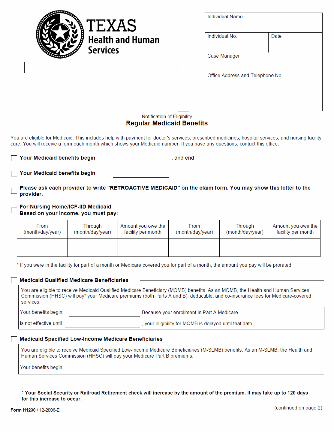 TX HHS Form H1230. Notification of Eligibility - Regular Medicaid Benefits