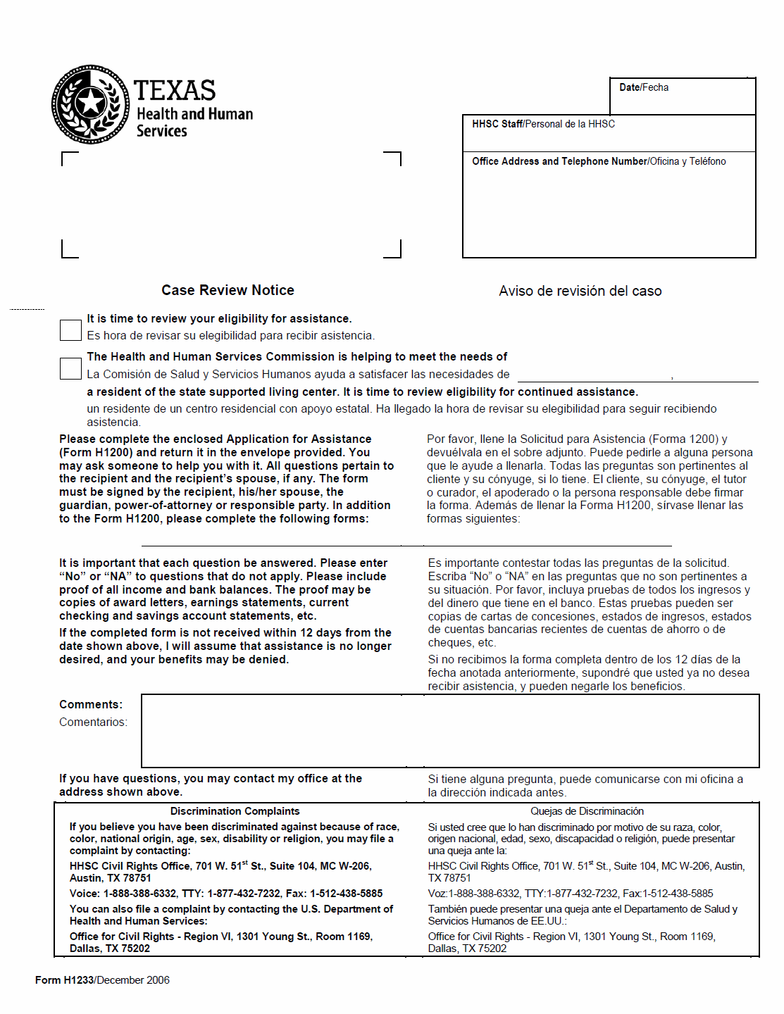 If the completed form is not received within 12 days from the date shown above, it will be assumed that assistance is no longer desired, and benefits may be denied. If you have questions or concerns, you can contact the issuing agency, Texas Health and Human Services (HHS), at the address shown above. Key points to note include: