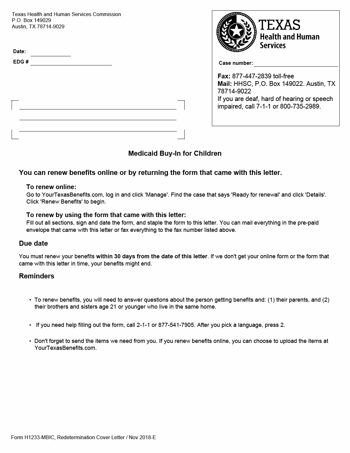 TX HHS Form H1233-MBIC. Redetermination Cover Letter (Medicaid Buy-In for Children)